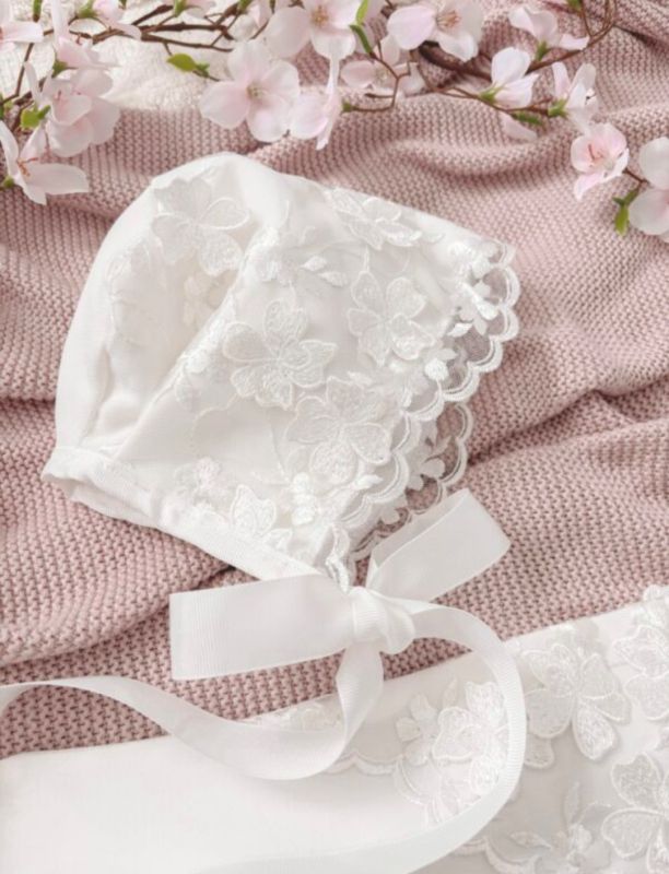 Czapka do chrztu, pasuje do sukienki Meghan. Czapka ma podszewkę bawełniną. Zawiązywana tasiemką rypsową. W kolorze bieli śmietankowej.