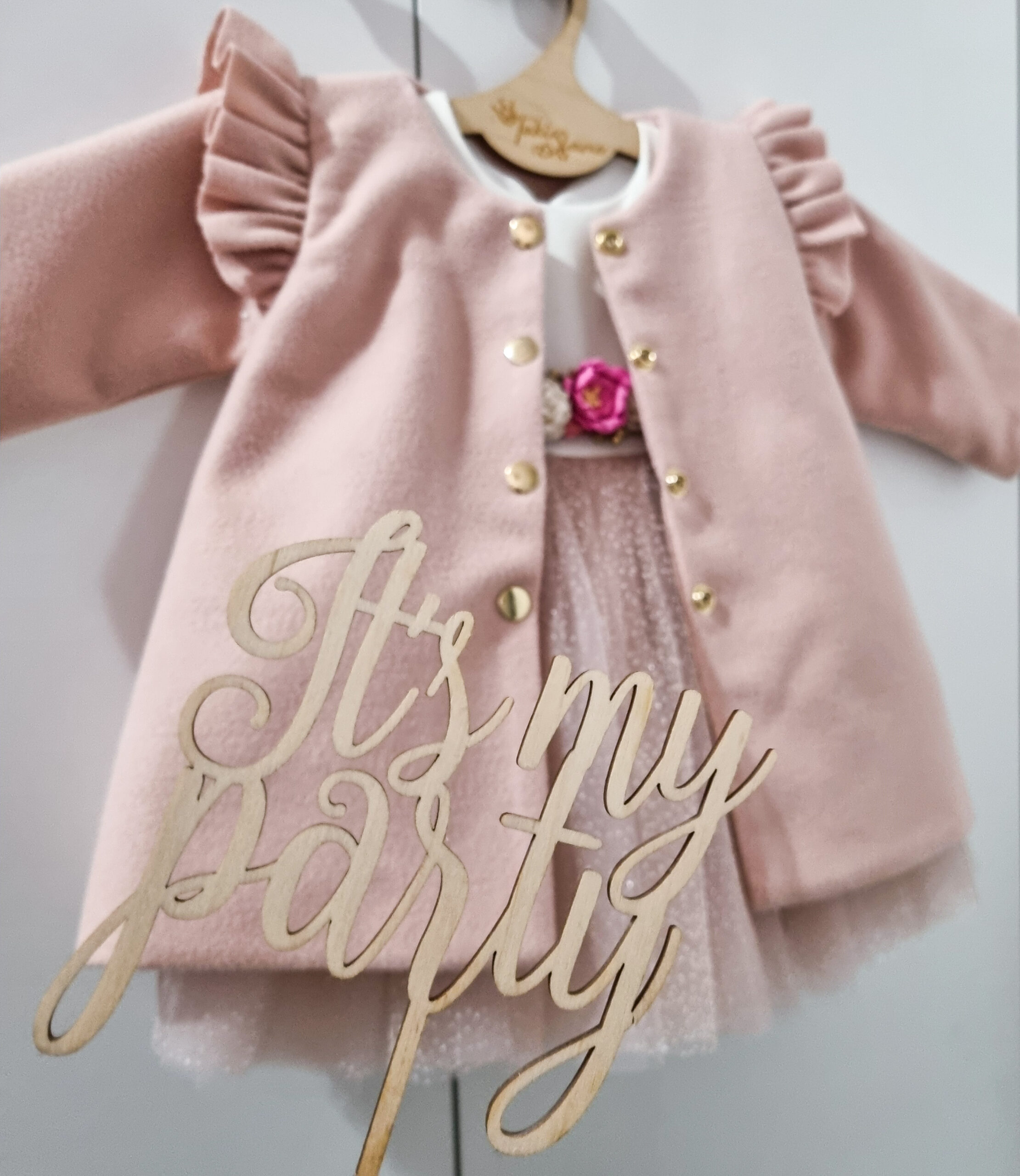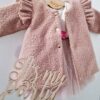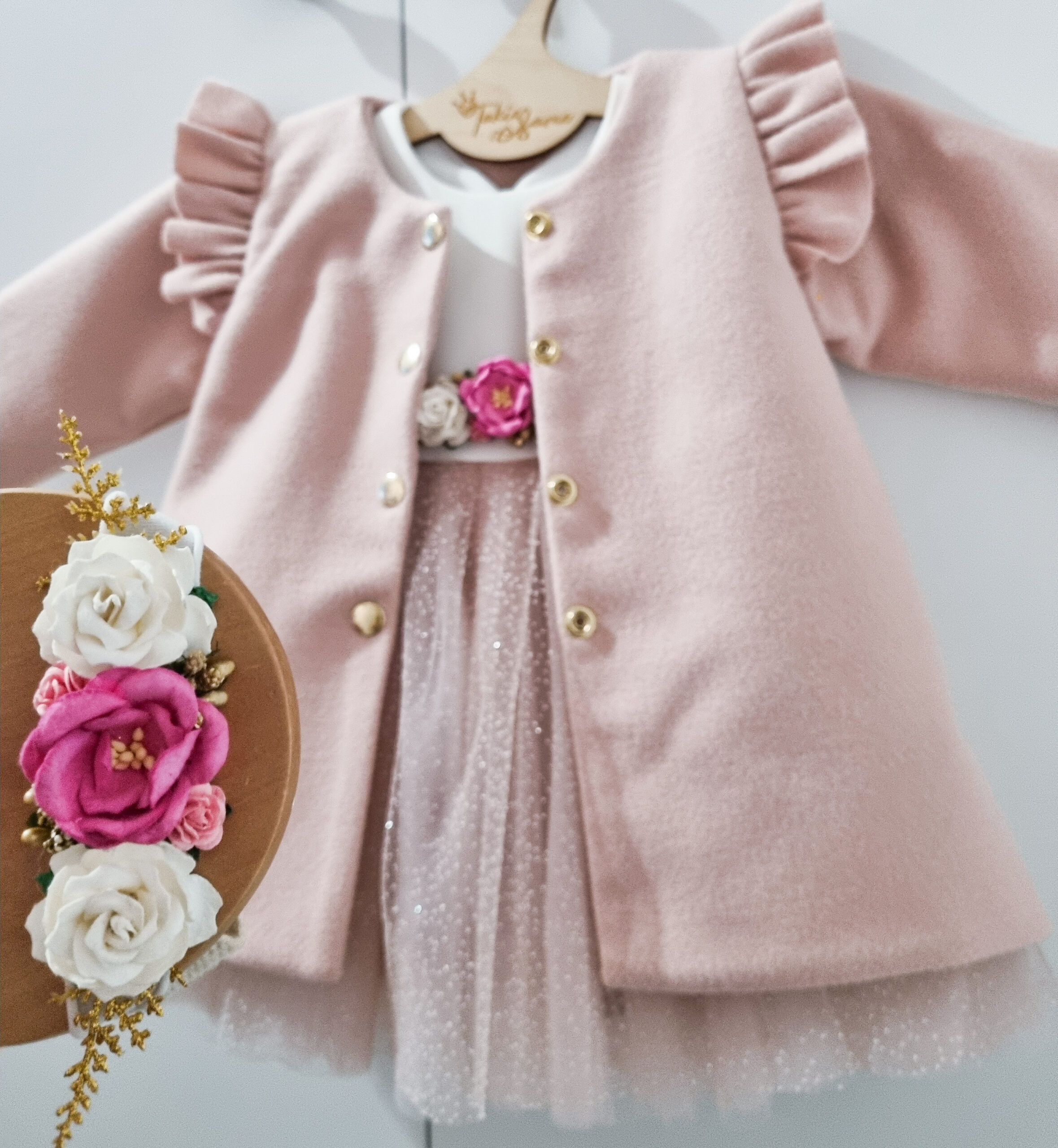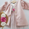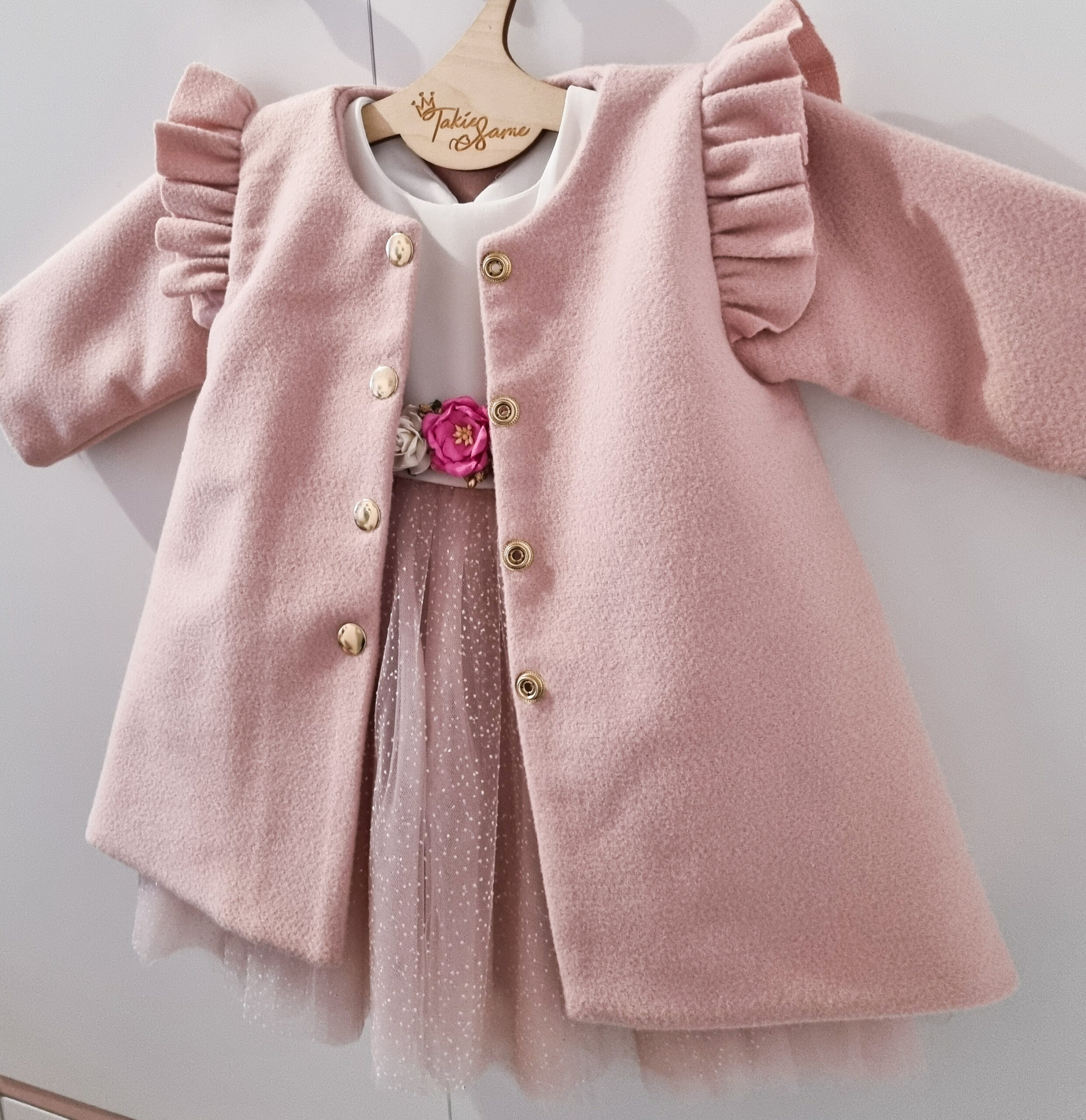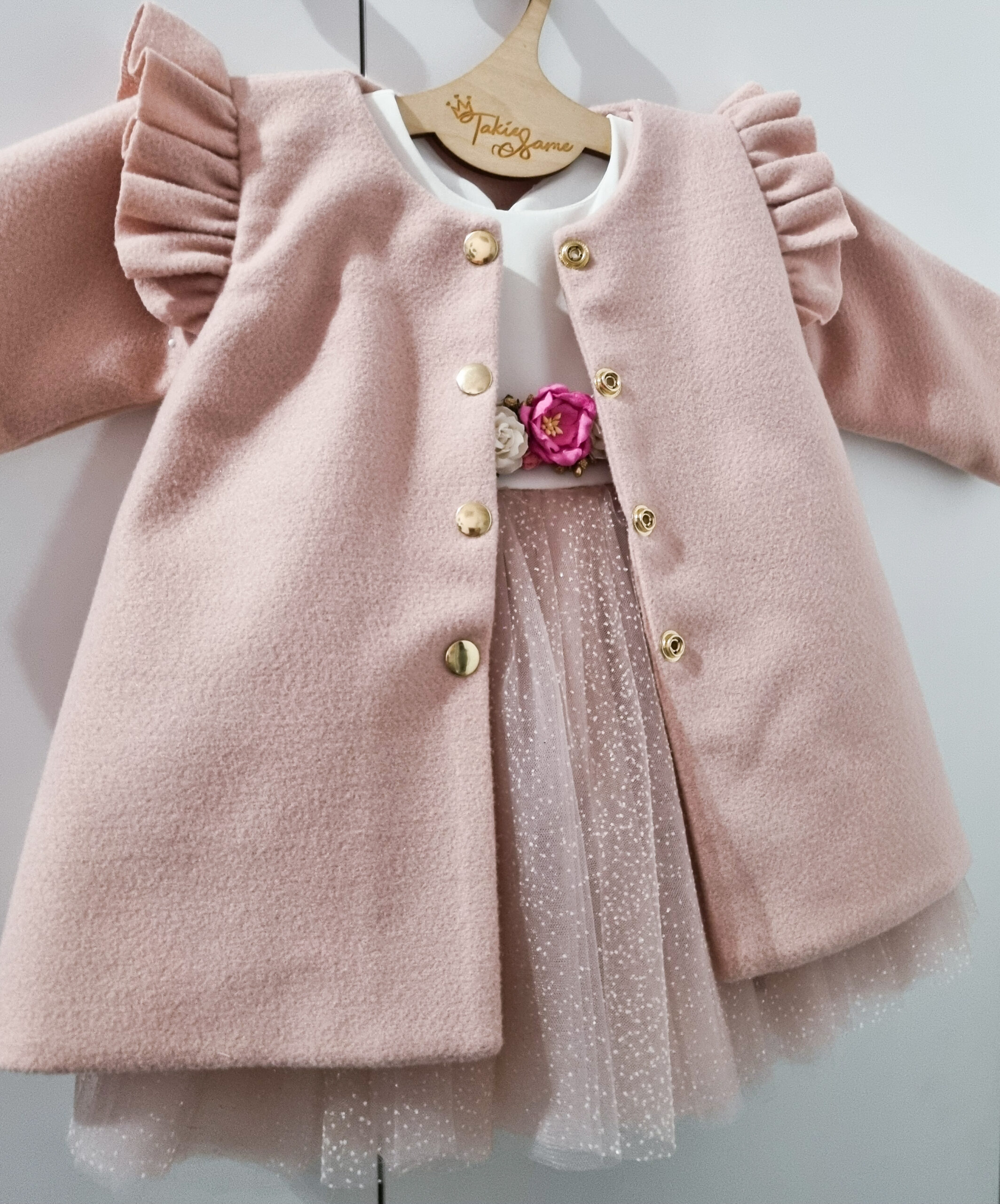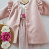 Płaszczyk dla dziewczynki z pagonami i złotymi guzikami. Do wyboru jest podszewka biała lub zimowa oraz kolor: róż i biel śmietankowa. Zapinany na złote zatrzaski. Szyty pod zamówienie