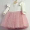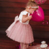 Tiulowa sukienka Adele, ultra dziewczęca. Niepowtarzalna i wyjątkowa, góra gładka z ozdobnymi pagonami, dół z kilkoma warstwami tiulu, warstwa wierzchnia to tiul z wnitowanymi perełkami, z tyłu ozdobna kokarda. Nikt nie przejdzie koło niej obojętnie. Sukienka może być na krótki lub długi rękaw. Z tyłu zapinana jest na zamek. Wykonana z tkaniny mięsistej, delikatnej, nie gniecie się, w środku podszyta bawełną. Kokardę można domówić, przypinana w formie broszki. Sukienka dostępna w rozmiarach 62-128