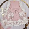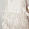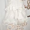 Wykonana z mięciutkiej koronki, kolor koronki się nie zmienia ( jest w bieli śmietankowej), pod spodem do wyboru kolor tkaniny: biel śmietankowa, brudny pastelowy róż. Sukienka na krótki rękaw do łokcia, tył zabudowany. Z tyłu zapinana jest na zamek. Wykonana z tkaniny mięsistej, delikatnej, nie gniecie się, w środku podszyta bawełną, ma kilka warstw tiulu, układa się w „bombkę”. Można domówić kokardę. Sukienka do uszycia w rozmiarach 62-104