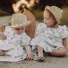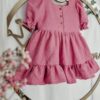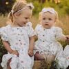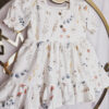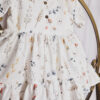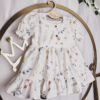 Sukienka dziecięca Bonita, w kwiatuszki i gałązki na białym tle, luźnego kroju, typu oversize, zapinana na guziczki kokosowe, guziczki mogą być z przodu lub z tyłu, można nosić ją na dwa sposoby, rękaw wykończony gumką i falbanką.