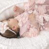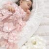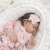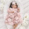 Dziecięca tiulowo koronkowa sukienka Diana, koronka w delikatnym z różowymi kwiatami 3D, materiał w kolorze różu lub bieli śmietankowej (kolor koronki 3D bez zmian). Można dodatkowo domówić kokardę przypinaną (w różu lub bieli śmietankowej), by uzupełnić stylizację. Sukienka może być na krótki lub długi rękaw (krótki rękaw do łokcia). Z tyłu zapinana jest na złote guziki. Wykonana z tkaniny mięsistej, delikatnej, nie gniecie się, w środku podszyta bawełną. Kokardę można domówić, przypinana w formie broszki.