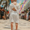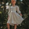 Sukienka dziecięca Lilia, sukienka może być w 2 wersjach rękawa, na długi tak jak na zdjęciu lub krótki do łokcia (wariant do wyboru). Wykonana z muślinu bawełnianego, 4 kolory do wyboru: ecru oraz szminkowy róż ze złotymi drobinkami, biel śnieżnobiała i śmietankowa.
