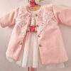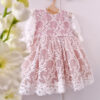Dziecięca tiulowo koronkowa sukienka Ella, koronka off white, materiał w kolorze różu. Można dodatkowo domówić kokardę przypinaną lub pasek z kwiatami, pasek może być w kolorze różu lub off white, by uzupełnić stylizację. Sukienka może być na krótki lub długi rękaw (długi rękaw możliwy do rozmiaru 92, ze względu na szerokość koronki). Z tyłu zapinana jest na zamek. Wykonana z tkaniny mięsistej, delikatnej, nie gniecie się, w środku podszyta bawełną. Kokardę można domówić, przypinana w formie broszki.