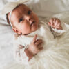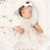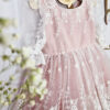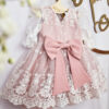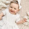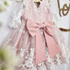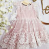 Wykonana z koronki, kolor koronki się nie zmienia ( jest w bieli śmietankowej), pod spodem do wyboru kolor tkaniny: biel śmietankowa, brudny pastelowy róż, beżowy lub błękit. Sukienka na krótki rękaw do łokcia, z tyłu wycięcie V (w okresie jesienno zimowym bez V, jeśli ma jednak być, prosimy o informację w uwagach) jeśli chcesz z niego zrezygnować napisz Nam w uwagach. Z tyłu zapinana jest na zamek. Wykonana z tkaniny mięsistej, delikatnej, nie gniecie się, w środku podszyta bawełną, ma kilka warstw tiulu, układa się w „bombkę”. Można domówić kokardę. Sukienka do uszycia w rozmiarach 62-104