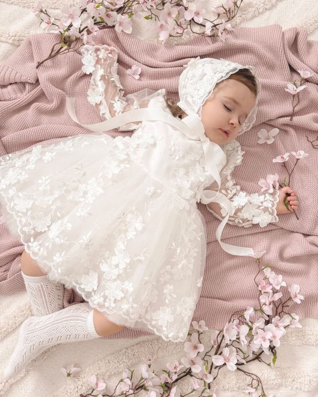 Dziecięca tiulowo koronkowa sukienka Meghan w kolorze bieli śmietankowej, koronka z delikatnymi kwiatami 3D, materiał w kolorze bieli śmietankowej (kolor koronki 3D bez zmian). Można dodatkowo domówić kokardę przypinaną (w różu lub bieli śmietankowej), by uzupełnić stylizację. Sukienka może być na krótki lub długi rękaw (krótki rękaw do łokcia). Z tyłu zapinana jest na zamek. Wykonana z tkaniny mięsistej, delikatnej, nie gniecie się, w środku podszyta bawełną. Kokardę można domówić, przypinana w formie broszki.