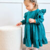 Sukienka dziecięca Muślinowa w złote kropeczki luźnego kroju, kolor petrol, jest to połączenie koloru niebieskiego z odrobiną zieleni, typu oversize, wiązanie na kokardkę może być z przodu lub z tyłu 🙂