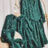 Sukienka dziecięca Muślinowa w srebrne gwiazdeczki i kropeczki w butelkowej zieleni, luźnego kroju, typu oversize, wiązanie na kokardkę może być z przodu lub z tyłu 🙂