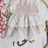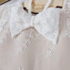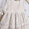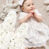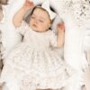 Wykonana z koronki, kolor koronki się nie zmienia ( jest w bieli śmietankowej), pod spodem do wyboru kolor tkaniny: biel śmietankowa, brudny pastelowy róż, beżowy. Sukienka na krótki rękaw, nie można zrobić długiego, ze względu na szerokość koronki, z tyłu zapinana jest na zamek. Wykonana z tkaniny mięsistej, delikatnej, nie gniecie się, w środku podszyta bawełną. Można domówić kokardę. Sukienka do uszycia w rozmiarach 62-104.