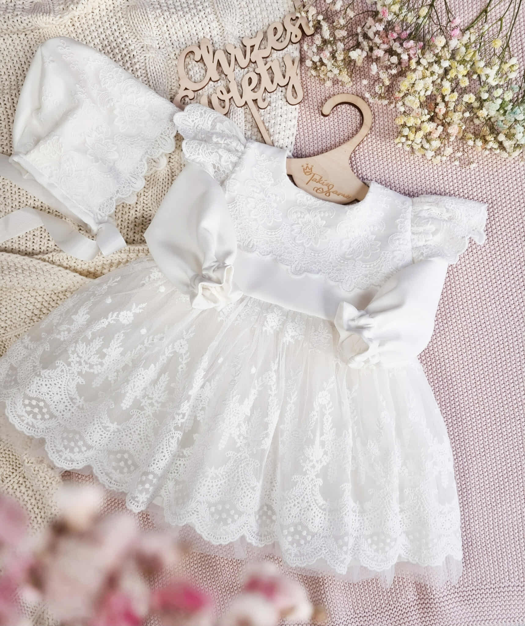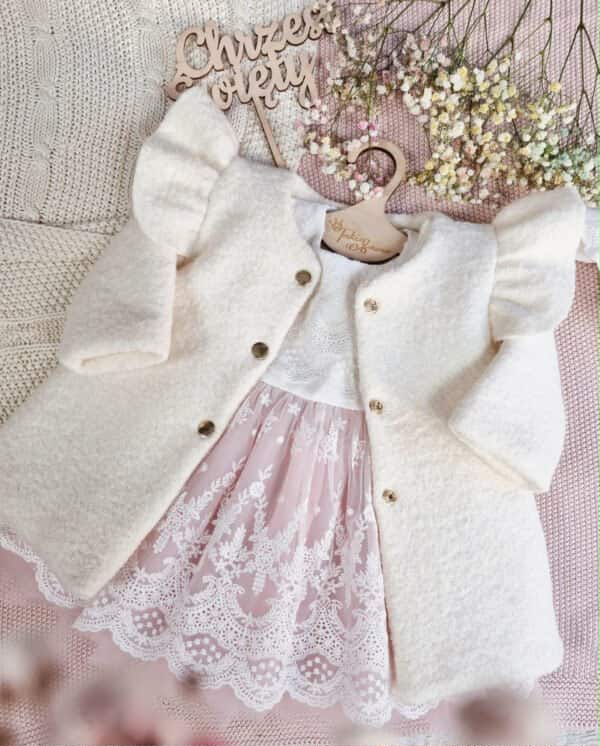 Sukienka Noemi to idealna propozycja dla dziewczynki w tak ważnym dniu jakim jest chrzest czy też roczek. Sukienka jest w kolorze bieli śmietankowej, może być na krótki lub długi rękaw. Piękna koronka znajduje się przy ramionach jak i na dole sukienki. Z tyłu zapinana jest na zamek. Wykonana z tkaniny mięsistej, delikatnej, nie gniecie się, w środku podszyta bawełną.
