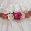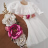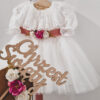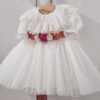 Dziecięca tiulowa sukienka Princeska w kolorze złamanej bieli. Niepowtarzalna i wyjątkowa, góra z bajecznym kołnierzem, dół z kilkoma warstwami tiulu, można dodatkowo domówić kokardę przypinaną lub pasek z kwiatami, by uzupełnić stylizację. Sukienka może być na krótki (sam kołnierz) lub długi rękaw. Z tyłu zapinana jest na zamek. Wykonana z tkaniny mięsistej, delikatnej, nie gniecie się, w środku podszyta bawełną. Kokardę można domówić, przypinana w formie broszki.