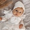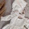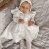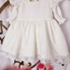 Sukienka Rozalia to idealna propozycja dla dziewczynki w tak ważnym dniu jakim jest chrzest czy też roczek. Sukienka jest w kolorze bieli śmietankowej, może być na krótki lub długi rękaw. Piękna koronka znajduje się przy ramionach jak i na dole sukienki. Z tyłu zapinana jest na zamek. Wykonana z tkaniny mięsistej, delikatnej, nie gniecie się, w środku podszyta bawełną.
