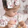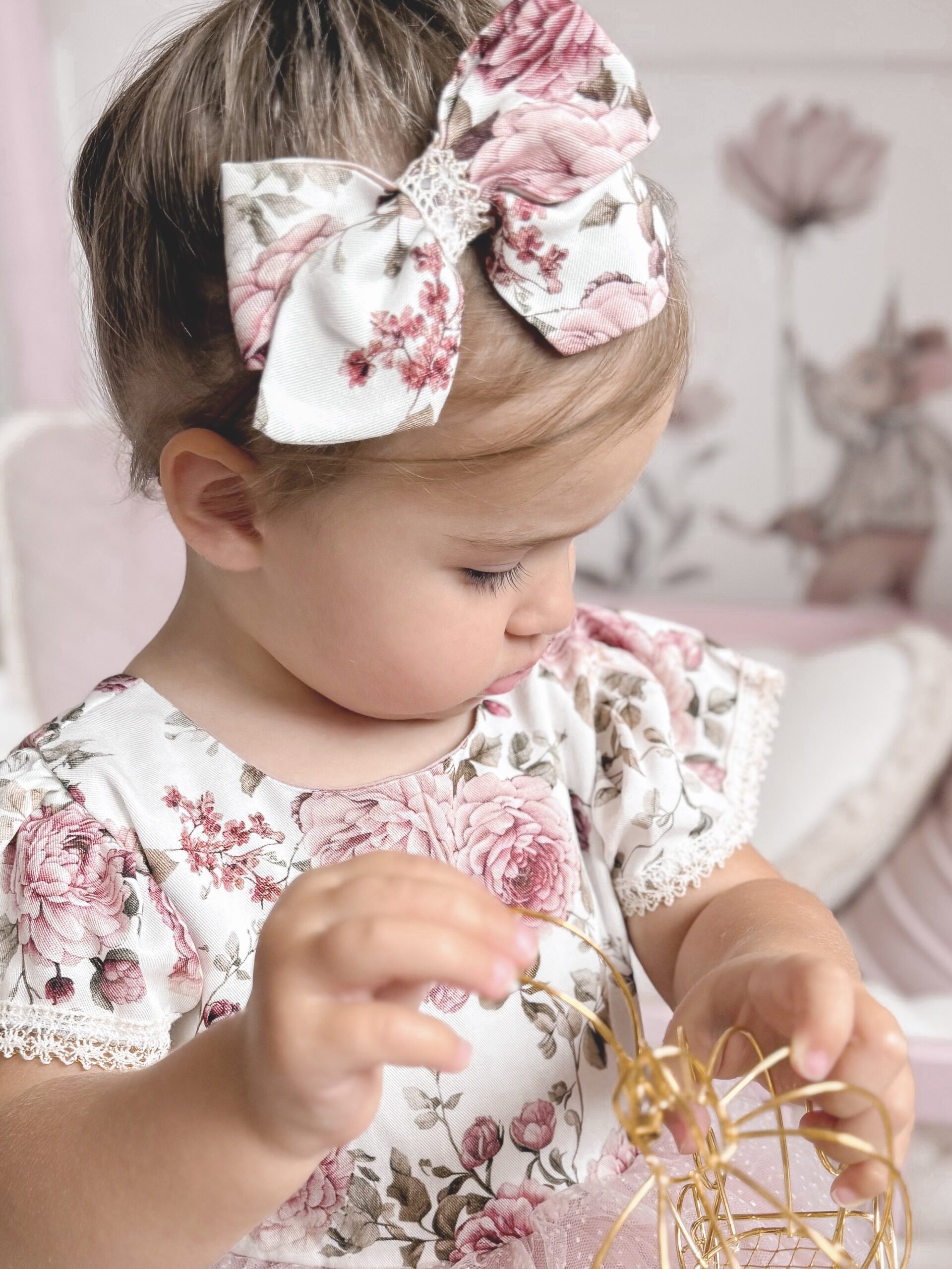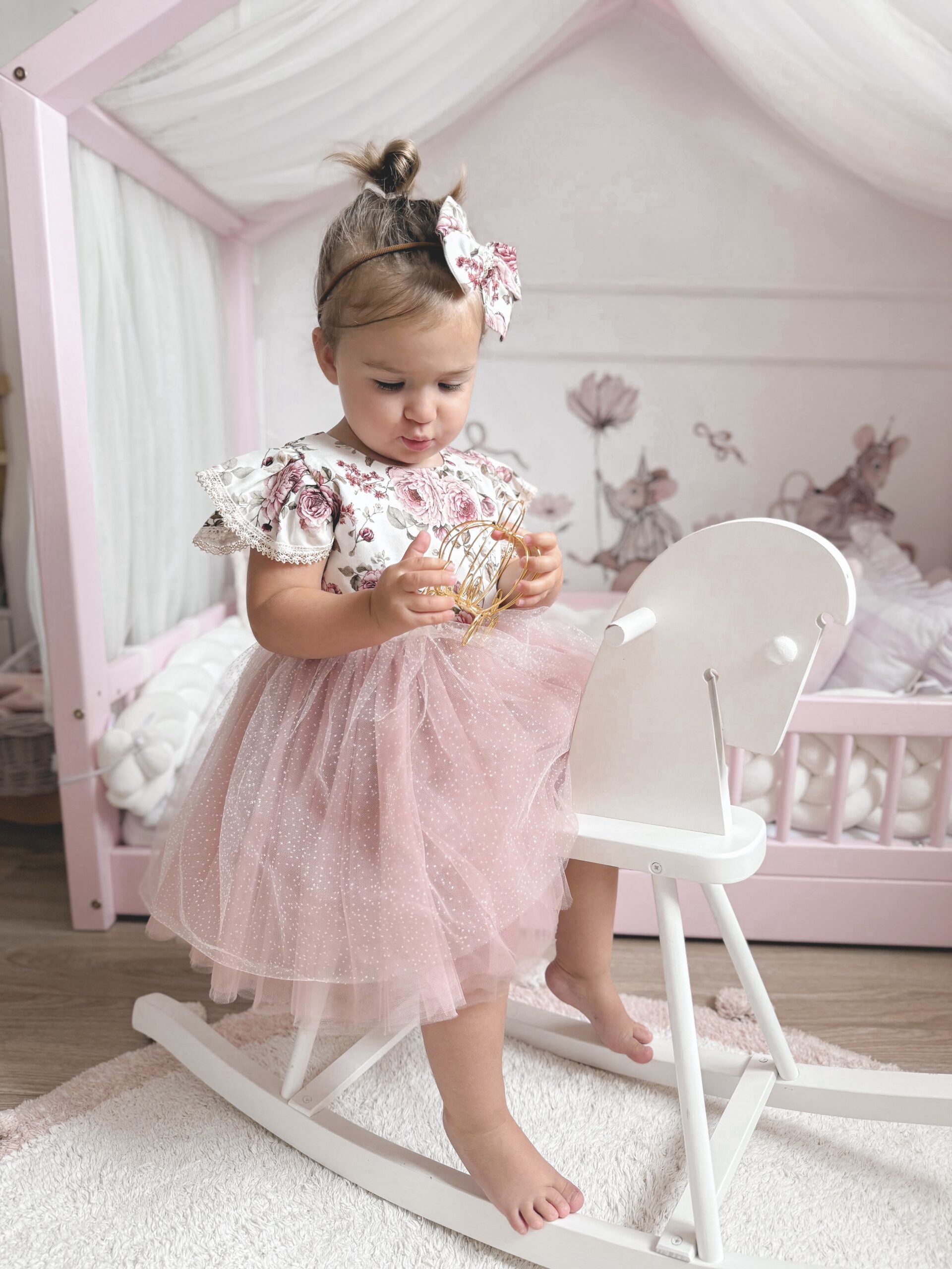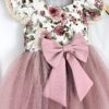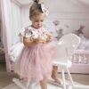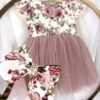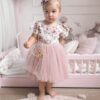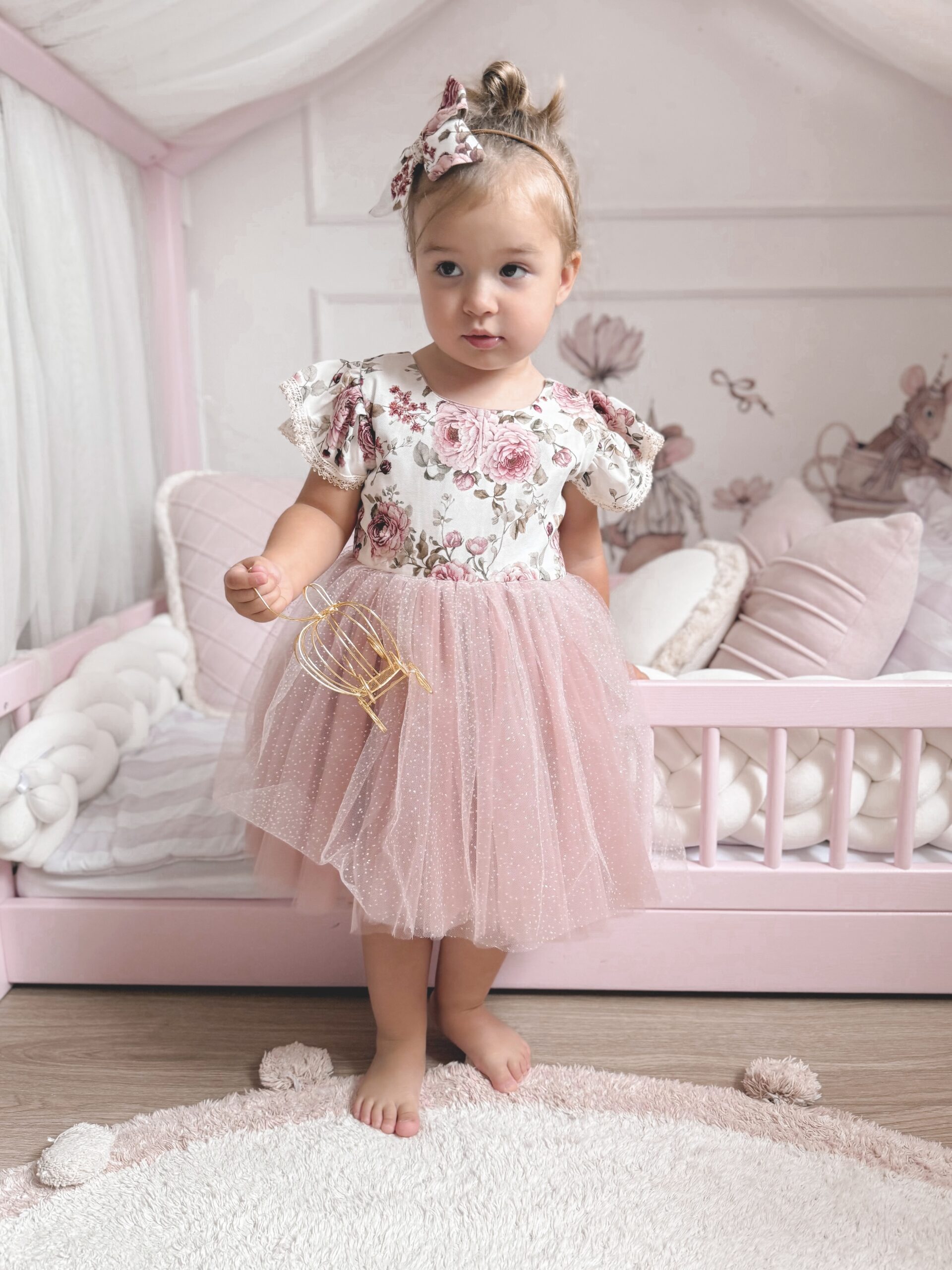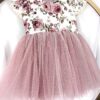Sukienka Kwiatowa z koronką i błyszczącym tiulem. Góra wykonana z tkaniny bawełnianej, warstwa wierzchnia tiulu jest błyszcząca, z tyłu ozdobna kokarda, przypinana w formie broszki, całość uzupełni piękna opaska lub spinka. Nikt nie przejdzie koło niej obojętnie. Sukienka może być na krótki lub długi rękaw. Z tyłu zapinana jest na zamek. Dół wykonany z tkaniny mięsistej, delikatnej, nie gniecie się, w środku podszyta bawełną. Kokardę można domówić, przypinana w formie broszki. Odcień tkaniny może się delikatnie różnić.