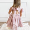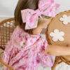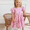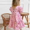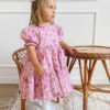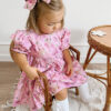 Sukienka dziecięca w różu w surfinie oraz piwonie, typu oversize, zapinana na drewniane guziki.