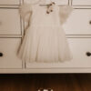 Tiulowa sukienka Wika. Góra sukienki z ozdobnymi piórkami i tiulem brokatowym, w całości w bieli śmietankowej. Warstwa wierzchnia sukienki może był gładka, tak jak na zdjęciu głównym lub może być warstwa tiulu z perłami (tak jak w sukience Adele). Sukienka może być na krótki lub długi rękaw ( długi rękaw gładki, materiałowy: prosty lub zakończony gumeczką, napisz nam w uwagach jaką opcję wybierasz). Z tyłu zapinana jest na zamek. Wykonana z tkaniny mięsistej, delikatnej, nie gniecie się, w środku podszyta bawełną. Sukienka dostępna w rozmiarach 62-128. Uwaga- Delikatna zmiana tiulu z brokatem na górę sukienki. Na górze sukienki tiul z brokatem (tiul jest delikatnie szorstki, jednak od spodu sukienka podszyta jest bawełną), pióra są na taśmie, mogą delikatnie wypadać, nie jest to zależne od Nas. Tiul jak i pióra nie podlegają reklamacji, prosimy o rozważny wybór.